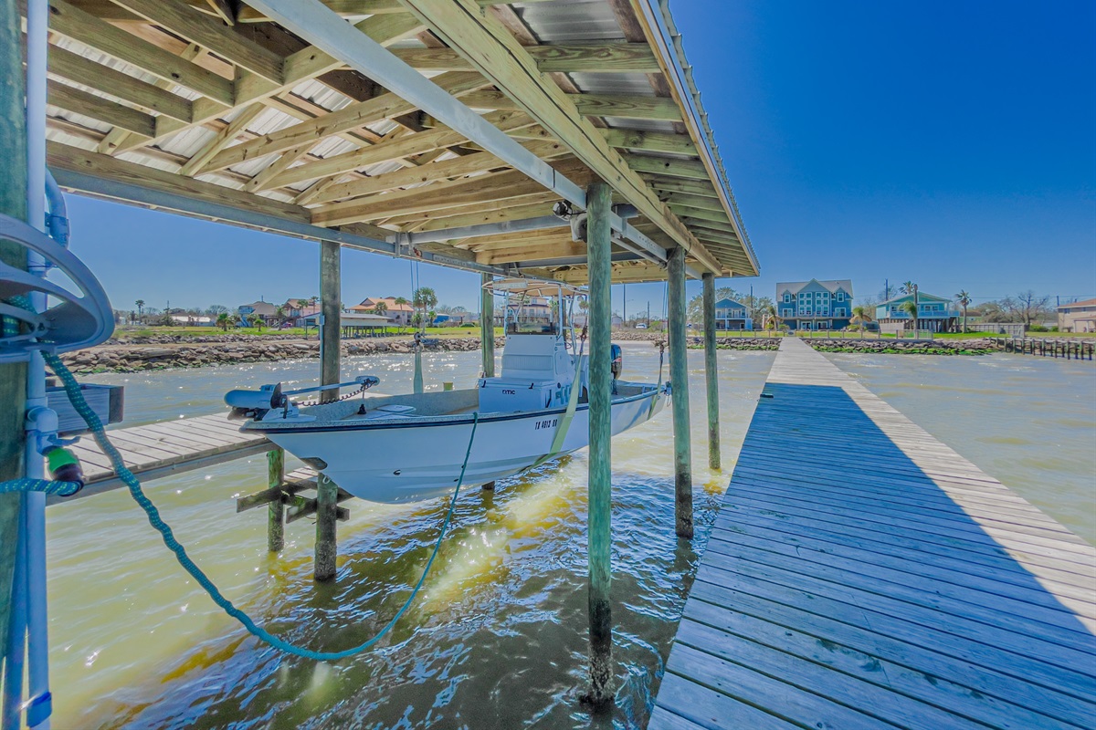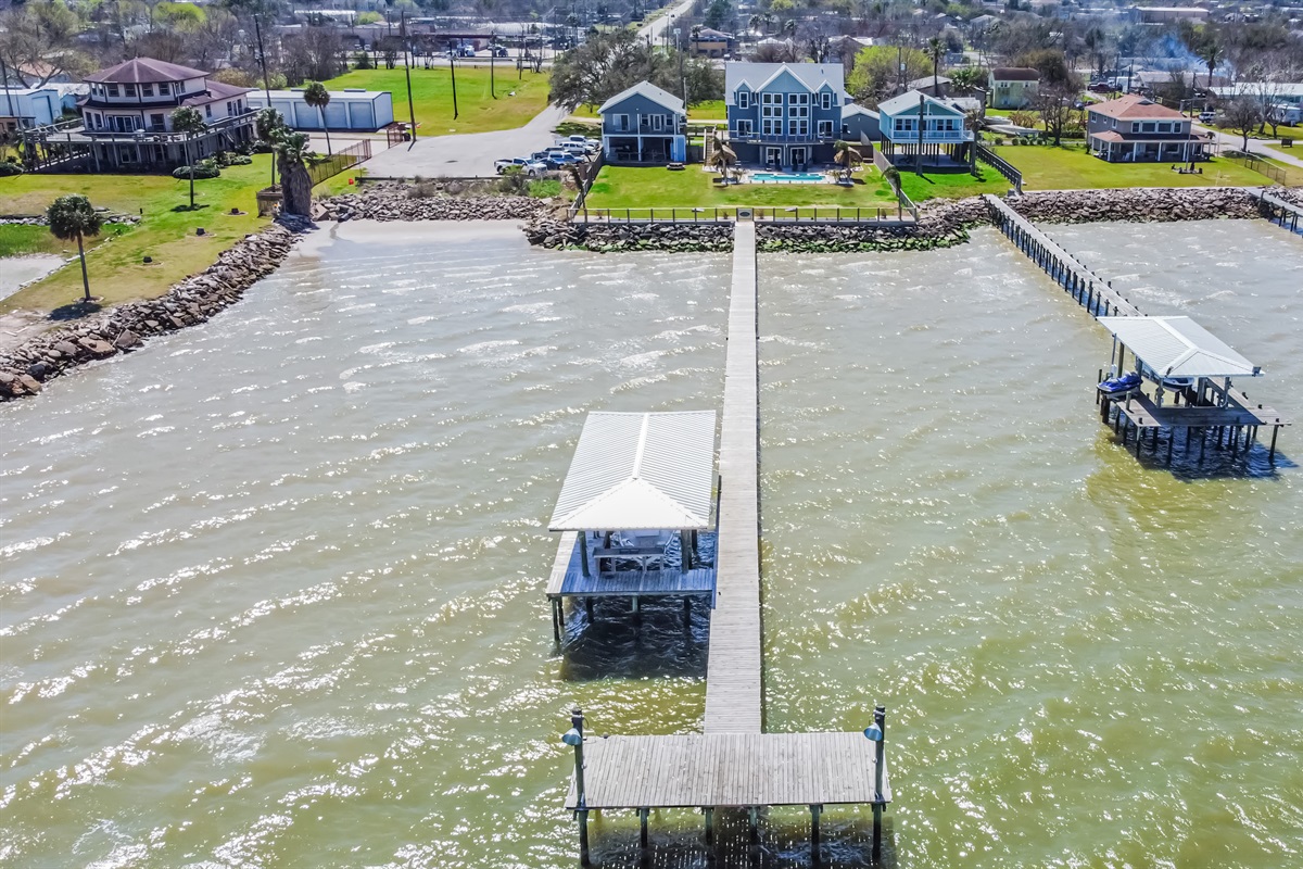 Stunning waterfront home on Galveston Bay with pool and hot tub plus a private pier & dock. Book a Guided Fishing Trip, JetSki's, Golf Cart and much more with your host, just ask us the details!